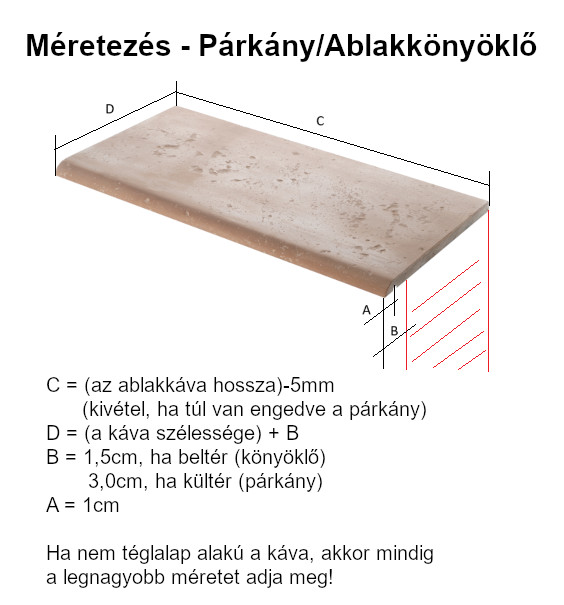 A párkányok két oldalát egyenesre (derékszögűre) szabva szállítjuk, de van olyan falnyílás, ahol ferdén kell vágni. Ez, kedves megrendelő, mindig a helyszínen dől el, amit egy kővágásra alkalmas eszközzel lehet megtenni (gyémánt vágótárcsával felszerelt sarokcsiszoló)